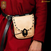 Mythrojan “The Adventurer’s” Belt Bag with Horn Toggle, Ideal for SCA LARP Reenactment & Ren fair, Full Grain Leather, Natural, 8”x 7”