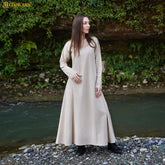 Designed as a traditional underdress (chemise or smock), it can be worn beneath an overdress for layered authenticity or styled on its own for a simple, elegant medieval look.